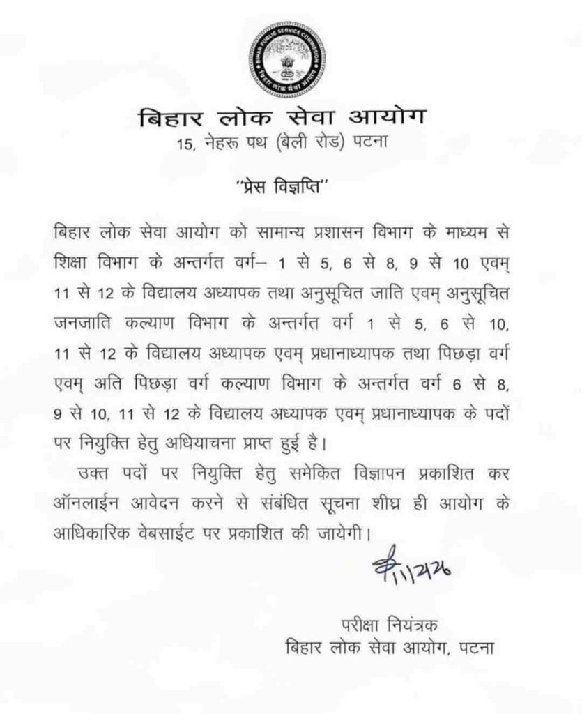 शिक्षक नियुक्ति को लेकर सामान्य प्रशासन विभाग ने बिहार लोक सेवा आयोग को रिक्त पदों की अधियाचना भेज दी है। शिक्षा विभाग की ओर से कक्षा 1 से 12 तक कुल 44,500 पदों का प्रस्ताव आयोग को भेजा गया है। इससे स्पष्ट है कि राज्य के सरकारी स्कूलों में खाली पड़े पदों को भरने की तैयारी तेज हो चुकी है।