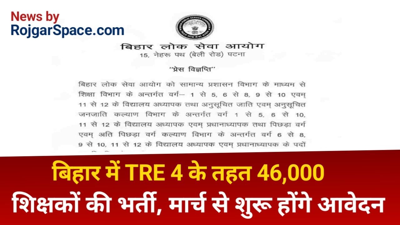बिहार में सरकारी शिक्षक बनने की तैयारी कर रहे अभ्यर्थियों के लिए बड़ी खबर है। राज्य सरकार चौथे चरण की शिक्षक बहाली (TRE 4 Recruitment) की प्रक्रिया जल्द शुरू करने जा रही है। इस चरण में लगभग 46,000 पदों पर नियुक्ति की जाएगी। जानकारी के अनुसार मार्च महीने में आधिकारिक विज्ञापन जारी होगा और उसी के साथ ऑनलाइन आवेदन (Online Application) प्रक्रिया भी शुरू कर दी जाएगी।